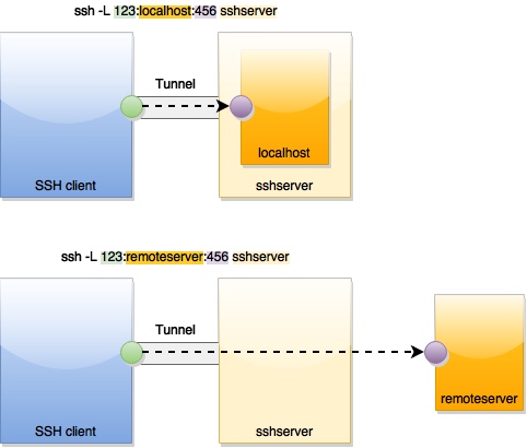 <local port>is forward to<remote host>:<remote port>. Therefore the application on<remote host>listening to<remote port>is used as if it was a local application. <remote host>is usually the same as<SSH server>, i.e.<remote host>is localhost relative to<SSH server>.<remote host>can be also be not on<SSH server>, i.e.<SSH server>is used as a bridge when data is forwarded from<SSH client>:<local port>and<remote host>:<remote port>